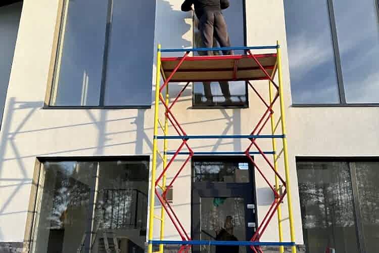 Мы используем специальное оборудование и Пинап для работы с окнами на большой высоте.